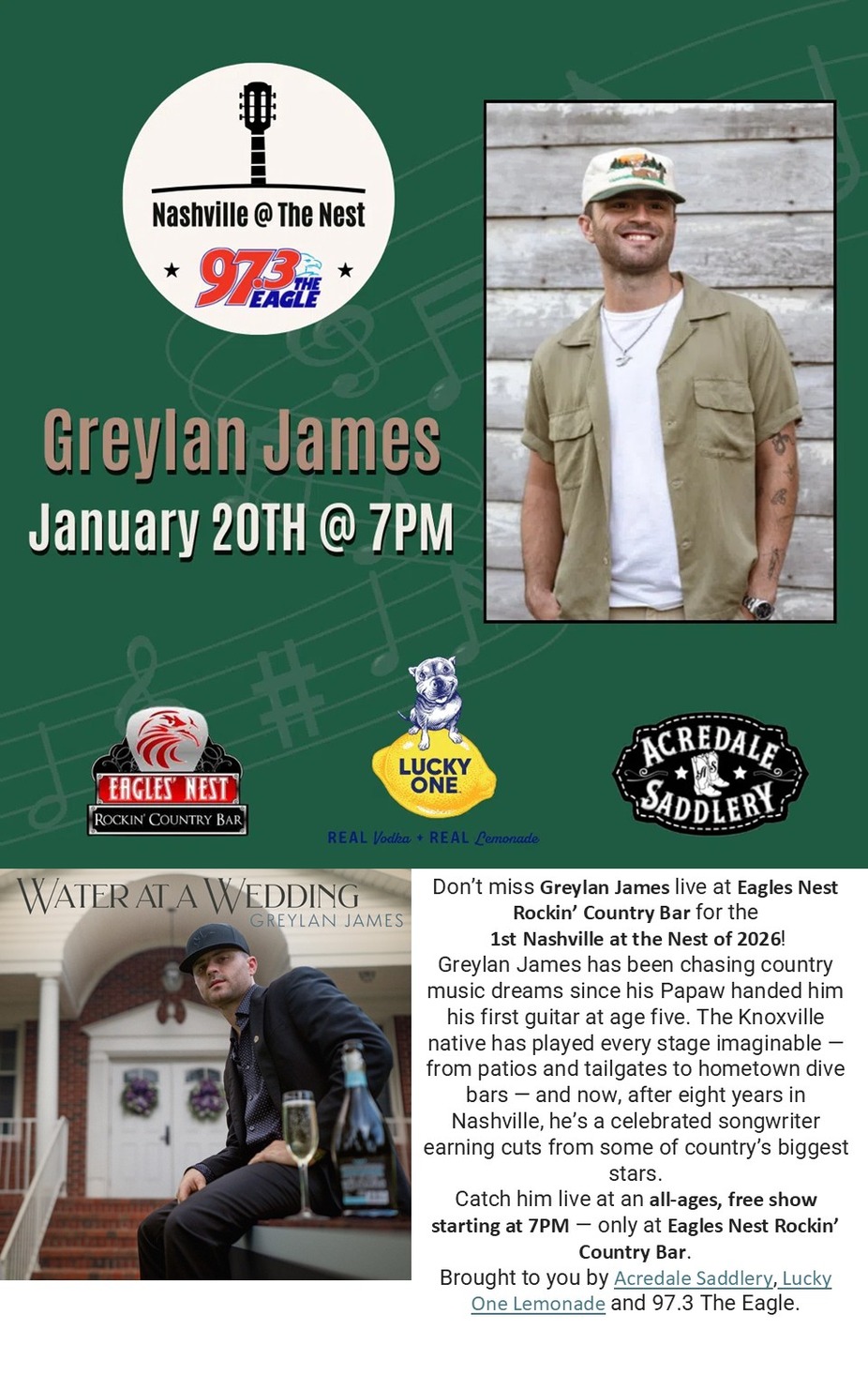 Don’t miss Greylan James live at Eagles Nest Rockin’ Country Bar for the first Nashville at the Nest of 2026.